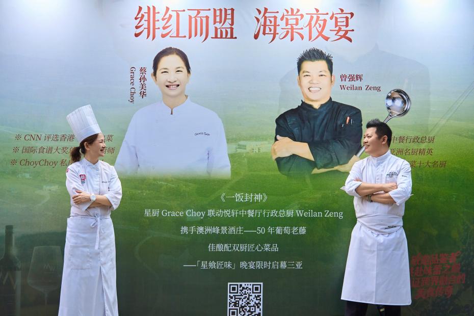 作为晚宴的核心环节,双厨联名菜品与峰景酒庄佳酿的精准搭配,成为全场焦点。CNN评选的香港十大私房菜主理人GraceChoy女士,与亚洲名厨精英、海南琼菜十大名厨曾强辉先生携手,打造了6道兼具地域特色与创新理念的联名位上佳肴。香港私房菜的精致巧思与海南琼菜的温润底蕴相得益彰,而3款峰景酒庄限定佳酿则根据菜品风味量身搭配,或中和鲜味、或提升层次、或呼应底蕴,让风土之味与烹饪之艺完美融合,每一口都呈现出“菜借酒韵,酒助菜香”的绝佳境界,为嘉宾带来全方位的味觉享受。