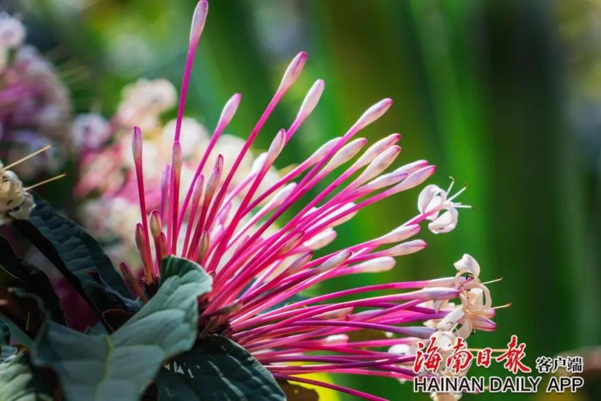 烟火树的花序呈放射状舒展,红粉花丝交织白色小花,造型别致,吸引游客前来合影,成为当地休闲游玩的新晋打卡点。