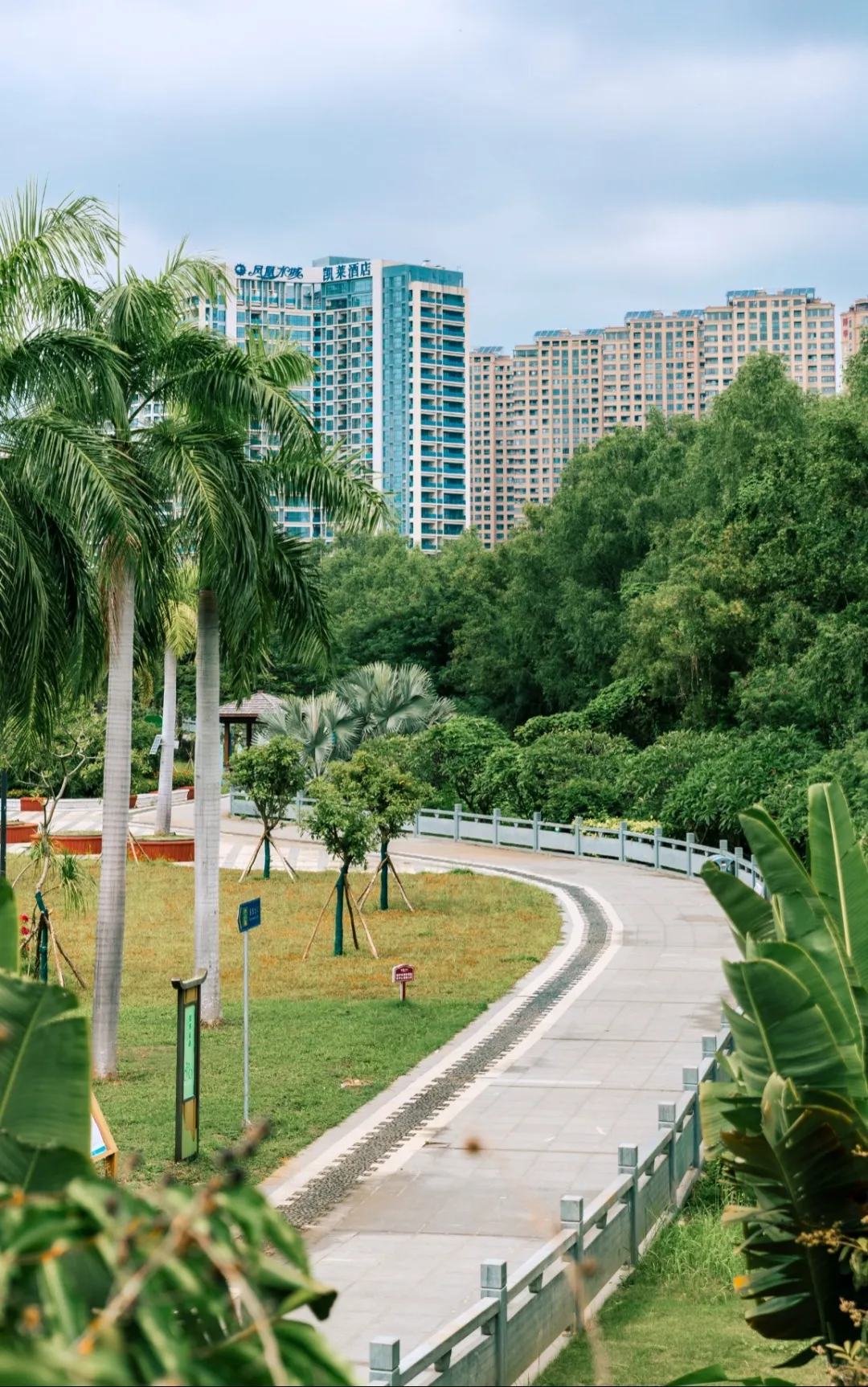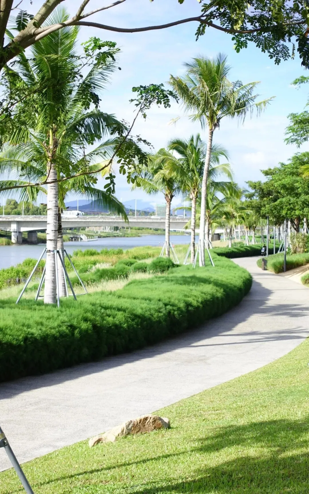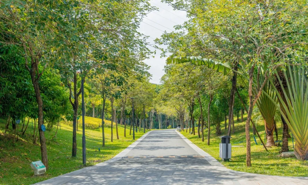 ◎推荐路线:公园东门→沿河骑行道→中心广场→椰林小道→返回东门
