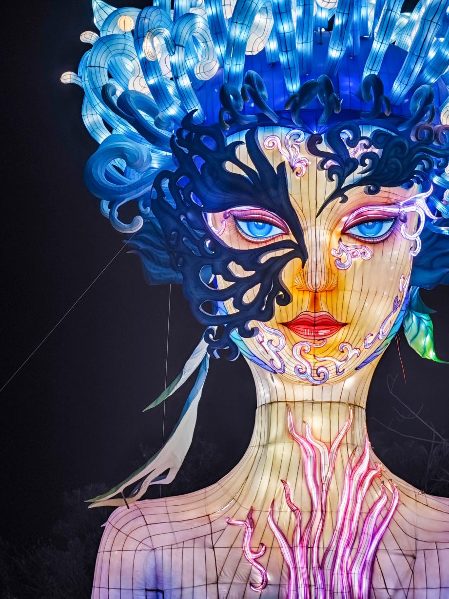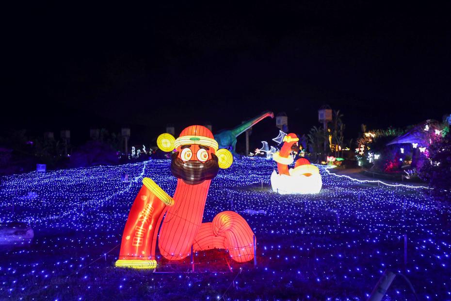 在千亩连绵的稻田之上,百余组精心设计的主题灯组星罗棋布,形成了“灯在田中、景在灯中”的独特景观,成为海棠湾乃至三亚地区规模最大、场景最为独特的实景光影艺术展。游客在园中穿梭于“华灯初上”“森林秘境”“重返侏罗纪”等五大主题区域,实现了移步换景的全景沉浸体验。