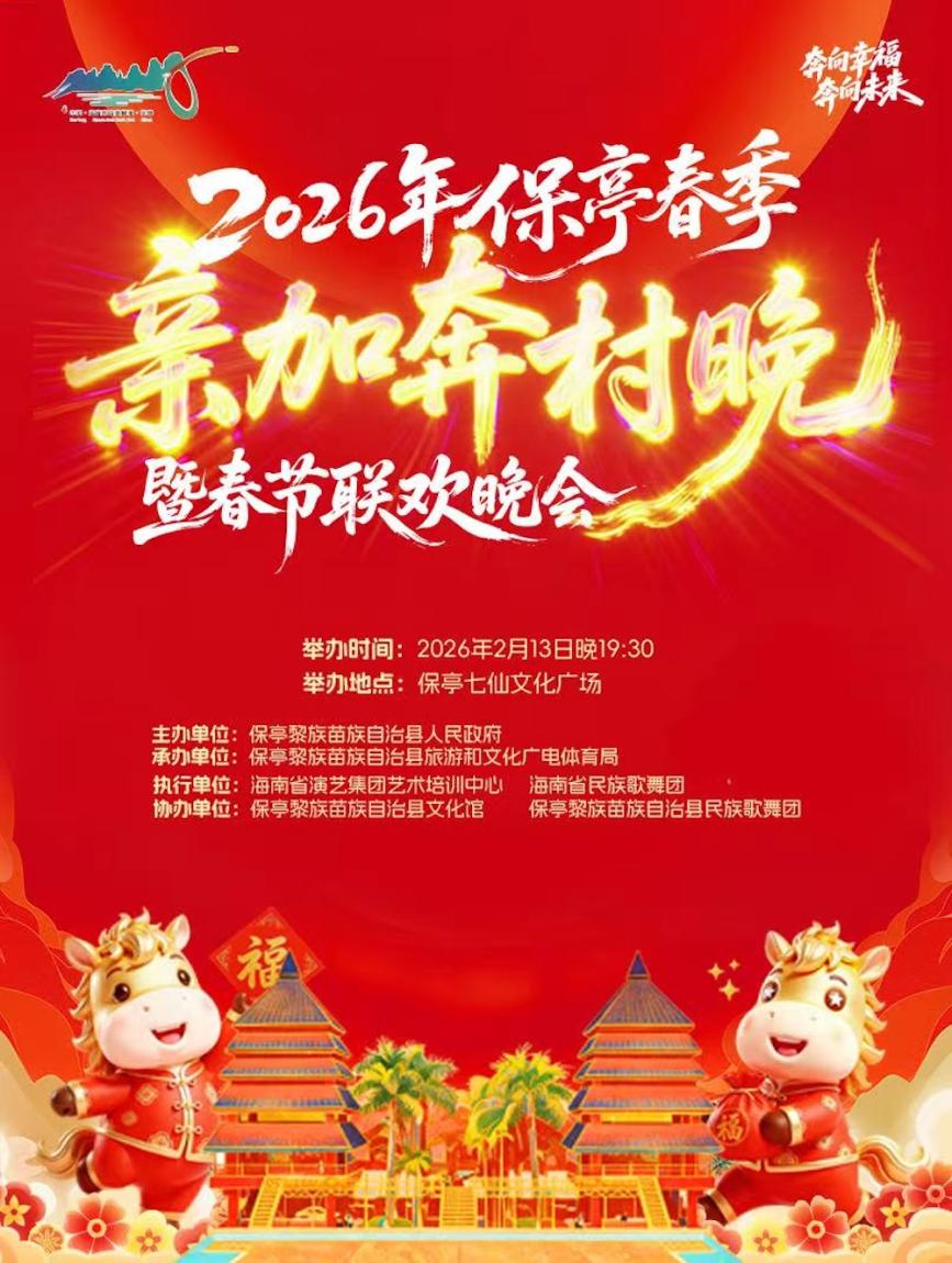 2026年保亭“亲加奔·村晚”春节联欢晚会将于2026年2月13日在保亭七仙文化广场举行。本次活动由保亭黎族苗族自治县人民政府主办,保亭黎族苗族自治县旅游和文化广电体育局承办,海南省演艺集团艺术培训中心、海南省民族歌舞团具体执行,保亭黎族苗族自治县文化馆、保亭黎族苗族自治县民族歌舞团协办。