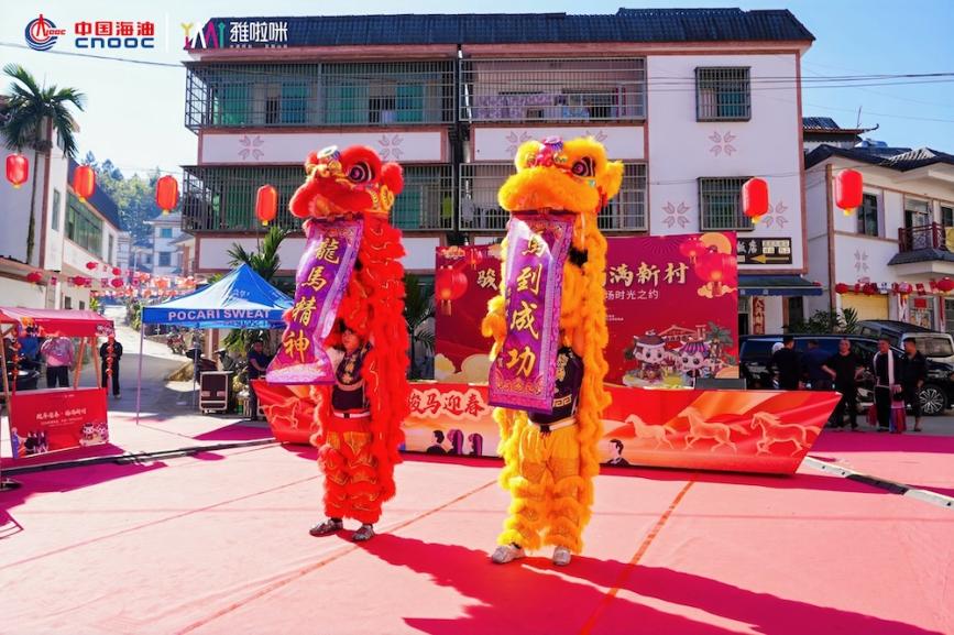 上午10时18分,开幕式在一片喜庆祥和中启动。伴随着铿锵有力的锣鼓声,两头色彩斑斓的传统醒狮跃上舞台,时而威武雄壮,时而憨态可掬,精彩的采青表演瞬间点燃了现场的热情。紧接着,庄重而神秘的苗族招龙舞压轴登场,身着盛装的苗族同胞手持法器,伴随着古朴的吟唱翩翩起舞。这不仅是水满新村传承民族文化的重要时刻,更是我们对新一年最美好的祈愿:风调雨顺,国泰民安!