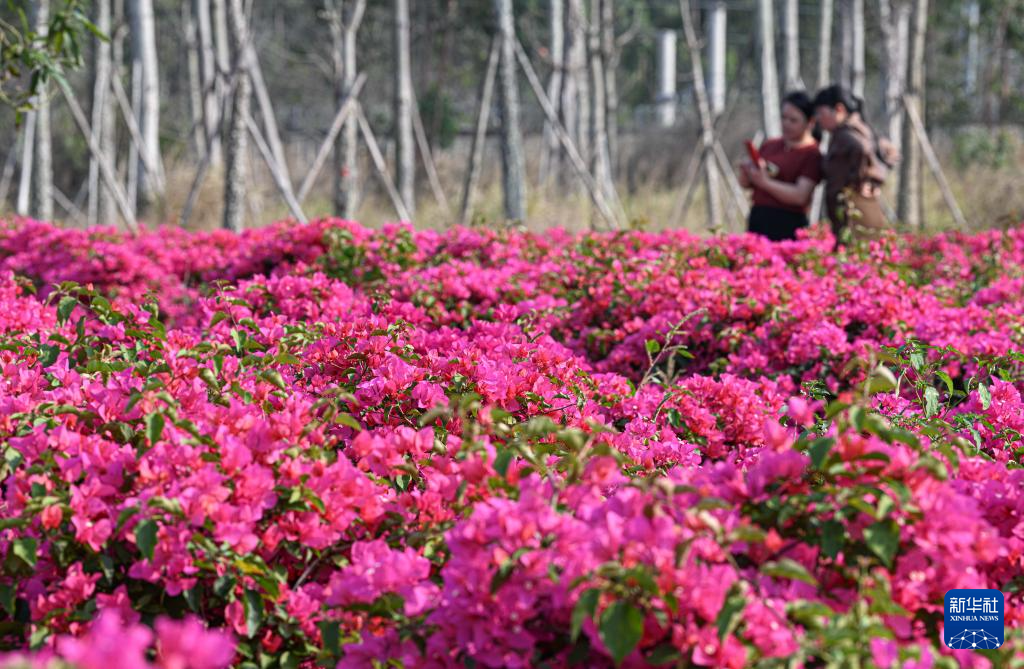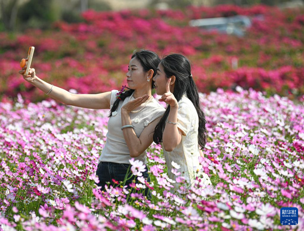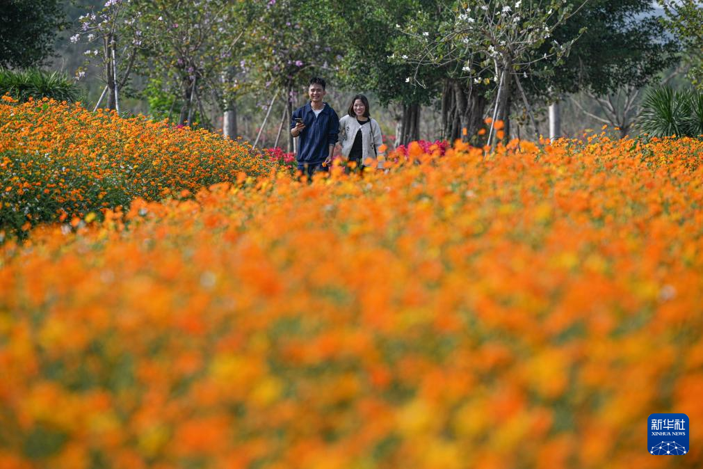 近日,在位于海南省昌江黎族自治县的聚源花卉博览园内,格桑花、硫华菊、三角梅等花卉竞相绽放,吸引了大批游客徜徉花海、打卡拍照,在诗意田园中邂逅烂漫春天。
