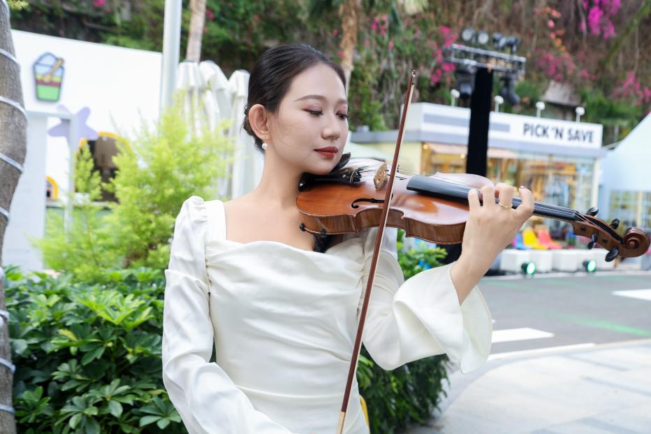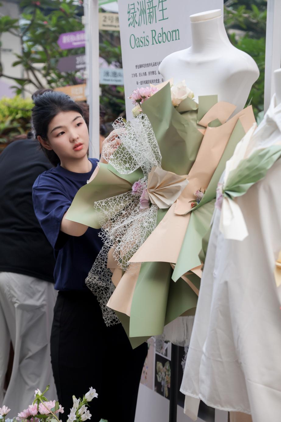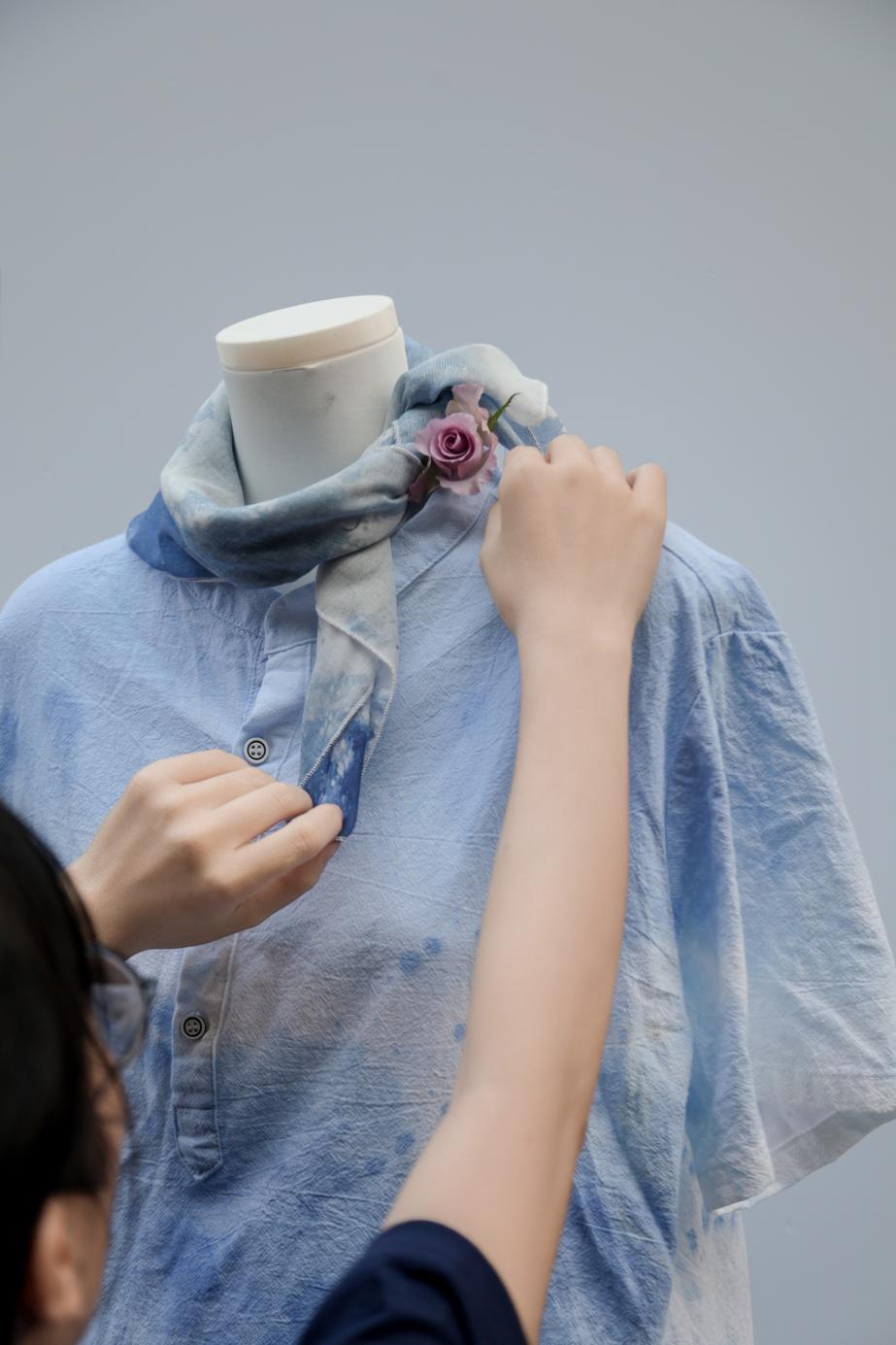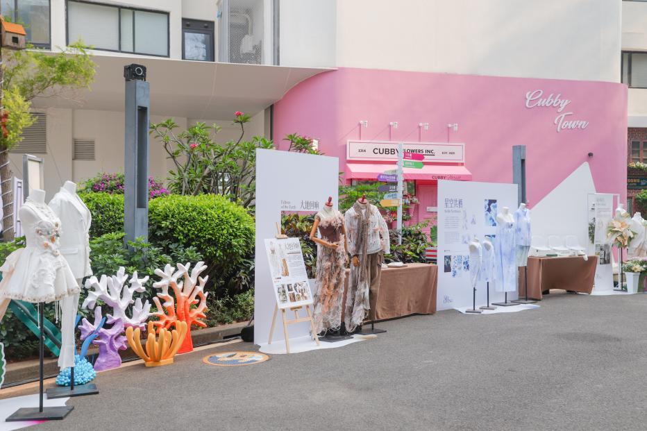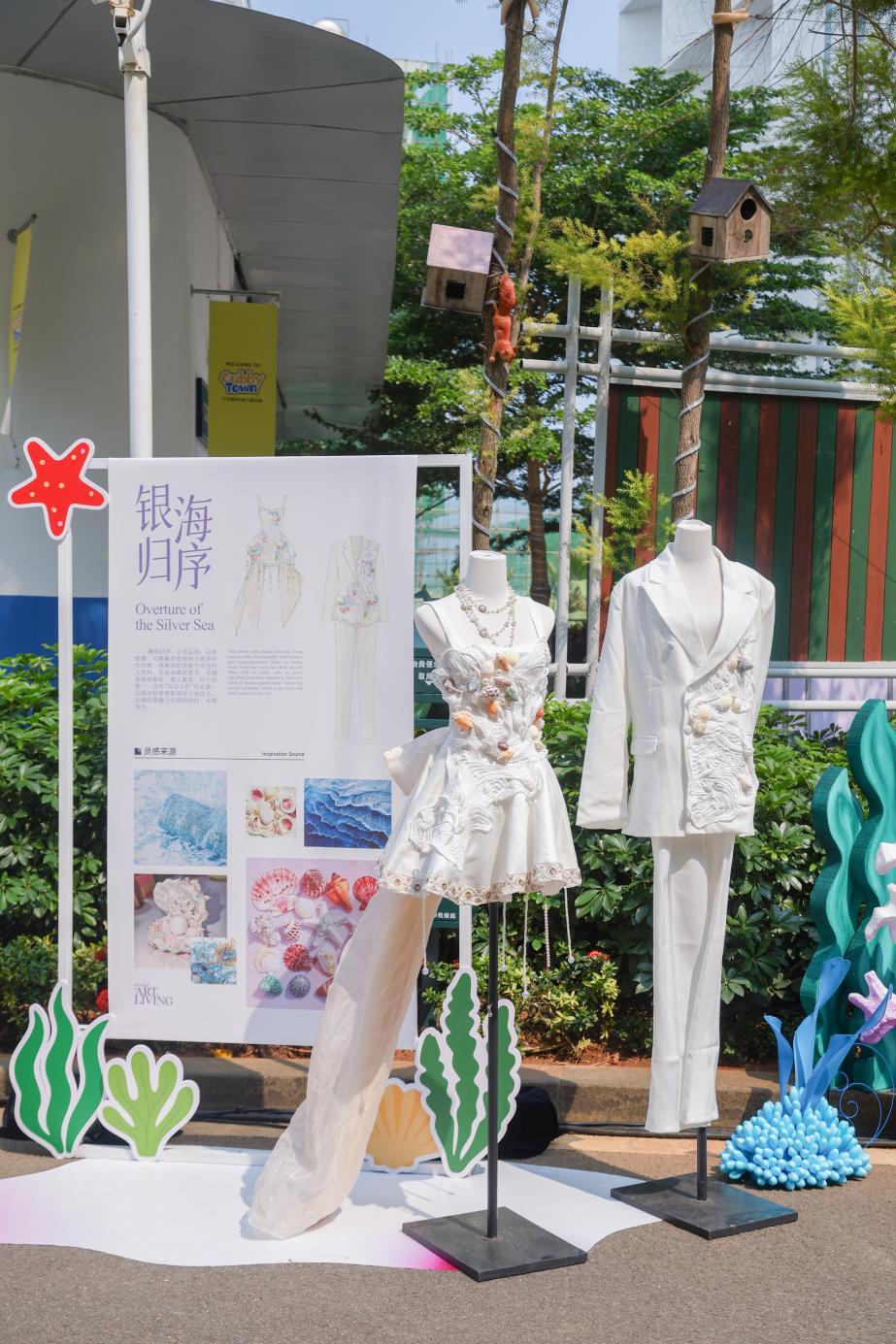 《大地回响》系列礼服以再生纤维与天然麻布勾勒大地伤痕,让荒漠走出最野的春天;《银海归序》系列礼服将有机棉与海洋再生纤维织入南海的浪痕与贝壳,挺括如礁岸,柔润似银辉,致敬海洋与守护者的双向奔赴;《绿洲新生》系列礼服以废弃的鲜花礼品纸与丝带折作繁花、缝成枝叶,每一道折痕都藏着延续的爱意,让归于尘埃的纸蜕作衣间不凋的绿洲;《星空共栖》系列礼服以植物靛蓝与由雅诗阁回收的客房破损布草晕染出星河肌理,指尖与织物的私语中,旧物与新生在星空下温柔共栖。小提琴演奏贯穿工坊与走秀全程,让创作与艺术共鸣。